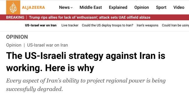 As American and Western media are desperate to convince people that America is getting its butts kicked by the Iranians before Trump and Netanyahu can win the war, Al Jazeera has published an article from an Arab Security Studies expert from the Doha Institute for Graduate Studies that presents a radically different, and from what I can tell, far more accurate account of how the war is going.