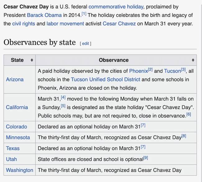 Barack Obama actually declared a "Cesar Chavez Day" as a federal observance holiday, and a number of states have made it an official state holiday, complete with paid time off, school closures, and all the hoopla that surrounds Presidents' Day or Thanksgiving.