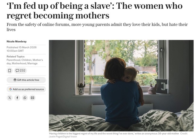 March 2026 has been a banner time for regretful parent stories, while the DINK propaganda period was last year, apparently. It makes you wonder whether is this hive mind behavior, or coordinated consciously.