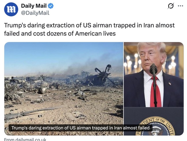 So while a wounded American Colonel was hiding in a mountain crevice at 7,000 feet in Iran with nothing but a pistol and a prayer, and the CIA was running a fake rescue convoy to confuse the IRGC, and MQ-9 Reapers were methodically deleting anyone who got within two miles of him, and special operators were prepping to fly INTO Iran, fight their way to a ridge, extract one man, have two planes get stuck in the sand, blow them up, fly in three MORE planes, fight their way OUT...