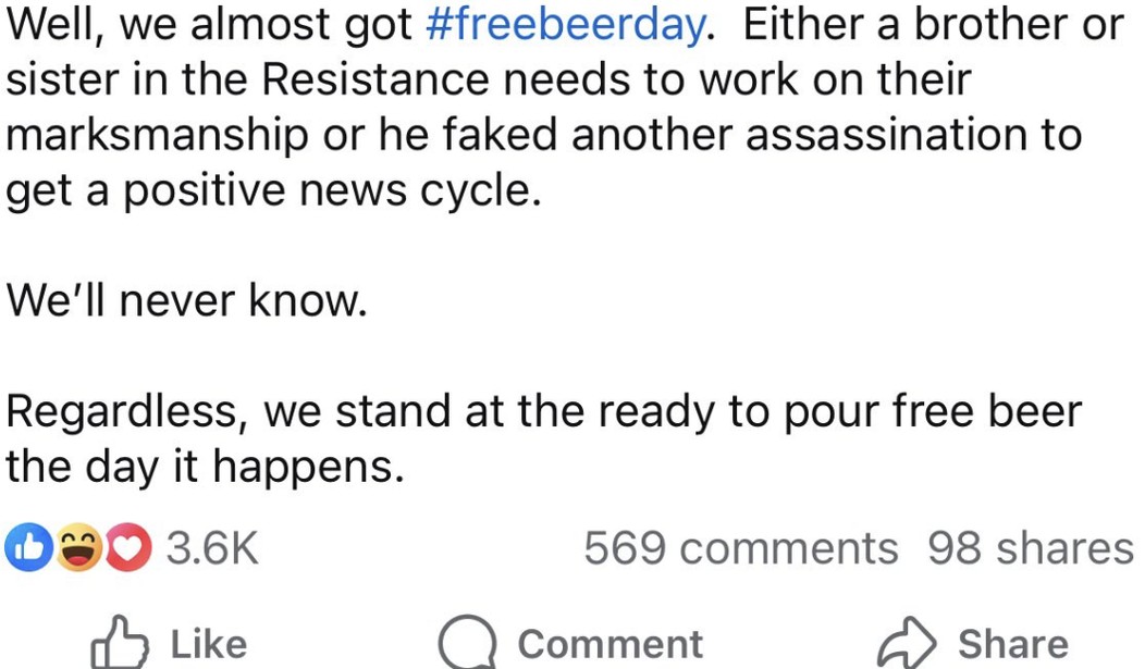 Obviously, Bangstad knows that this is good for business, since he has been pushing the "Free Beer Day" upon Trump's death for quite a while now, including selling T-shirts about it.