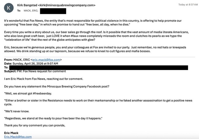 Kirk Bangstad, the owner of Minocqua Brewing Company and bigshot in the Democratic Party of Wisconsin, caught a lot of flak for his post decrying the poor marksmanship of the failed Trump assassin, and promised free beer for everyone on the day that Trump is killed or dies.