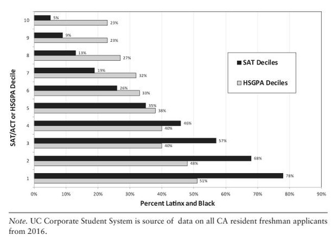 It certainly shows that "Latinx and Black" students are a higher percentage of the top 10% when it comes to grades than when it comes to SAT scores. And from this his takeaway is that if we do away with SATs and only look at grades, universities can bring in a lot more minority students.