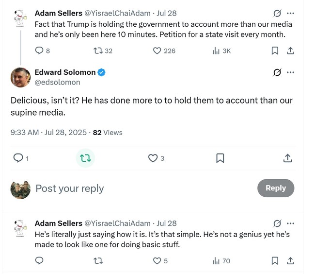 As for a damning indictment of Starmer's leadership, it only took about the first half hour of Trump's arrival in Scotland to start laying waste to that carefully constructed and ruthlessly guarded sand castle. Everyday Brits were glued to the TV and they liked what they saw, and stammering Starmer's squirming most of all.