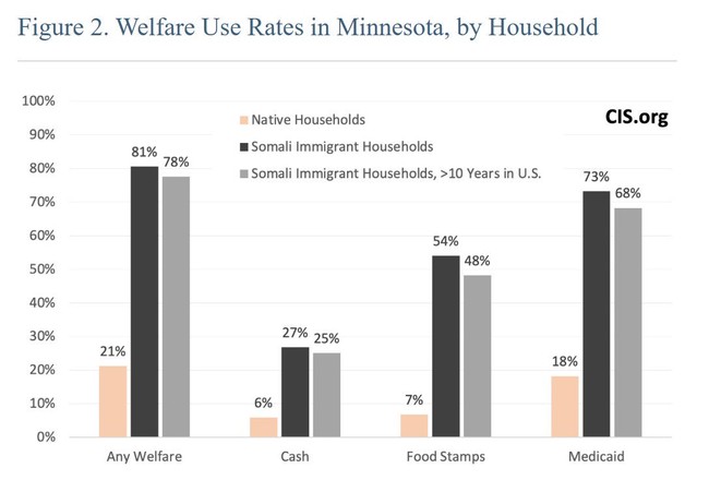 Feast your eyes on these numbers out of the Center for Immigration Studies (CIS) concerning the number of Somali households on welfare compared to the native US households in Minnesota. And, for giggles, they even broke out a third column that quantifies the number of Somali households who remain on welfare in the state after they've been residents for at least TEN YEARS.