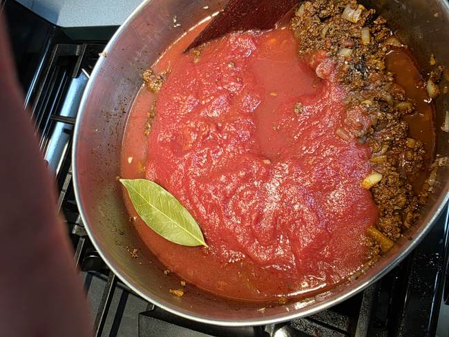 That's your cue to grab the tomato puree, some water, the bay leaf, and salt and pepper.