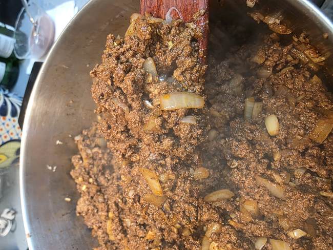 Get them all happy happy, working everything by moving them around every couple of minutes, plus keep breaking up those last chinks of meat that might have formed. You want the hamburger to be thoroughly cooked, almost to the point of being browned, and the onions will have become transparent, letting you know they're done as well.