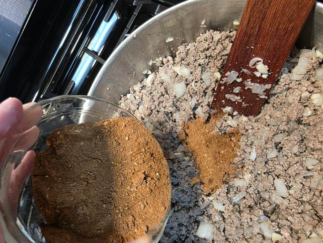 Now, the kitchen probably smells like a million bucks, but that ain't nuthin' yet. Take your little bowl of mixed up aromatics, and dump it over the meat mixture. Stir everything thoroughly together so that the heat will hit every last one of those spices. It will bloom the natural oils in them.