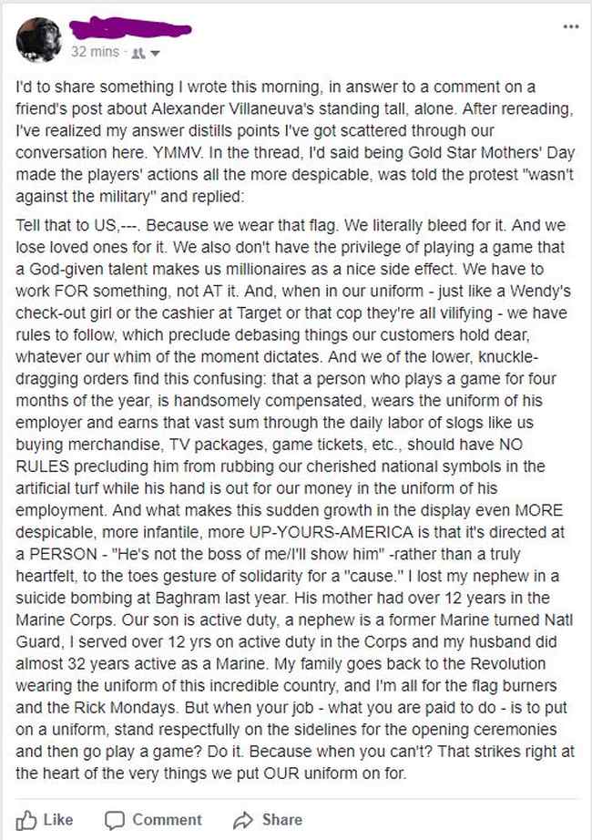 My breaking point was Colin Kaepernick. The kneeling. The disrespect. The NFL commissioner's indulgence of racist spoiled multi-millionaires' contempt for the beliefs and values of the people whose hard-earned dollars made them those millions for playing a game.