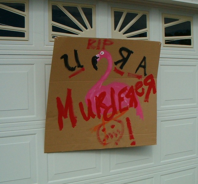 Some of the flamingos escaped, but others, sadly, were never found. After mutual midnight spray-paint tagging attacks on each other's 3/4-inch plywood hurricane shutters (this was post-Rita/Katrina in 2005), our neighbor woke up to a sign on his garage exposing his cruelty for the whole world to see.